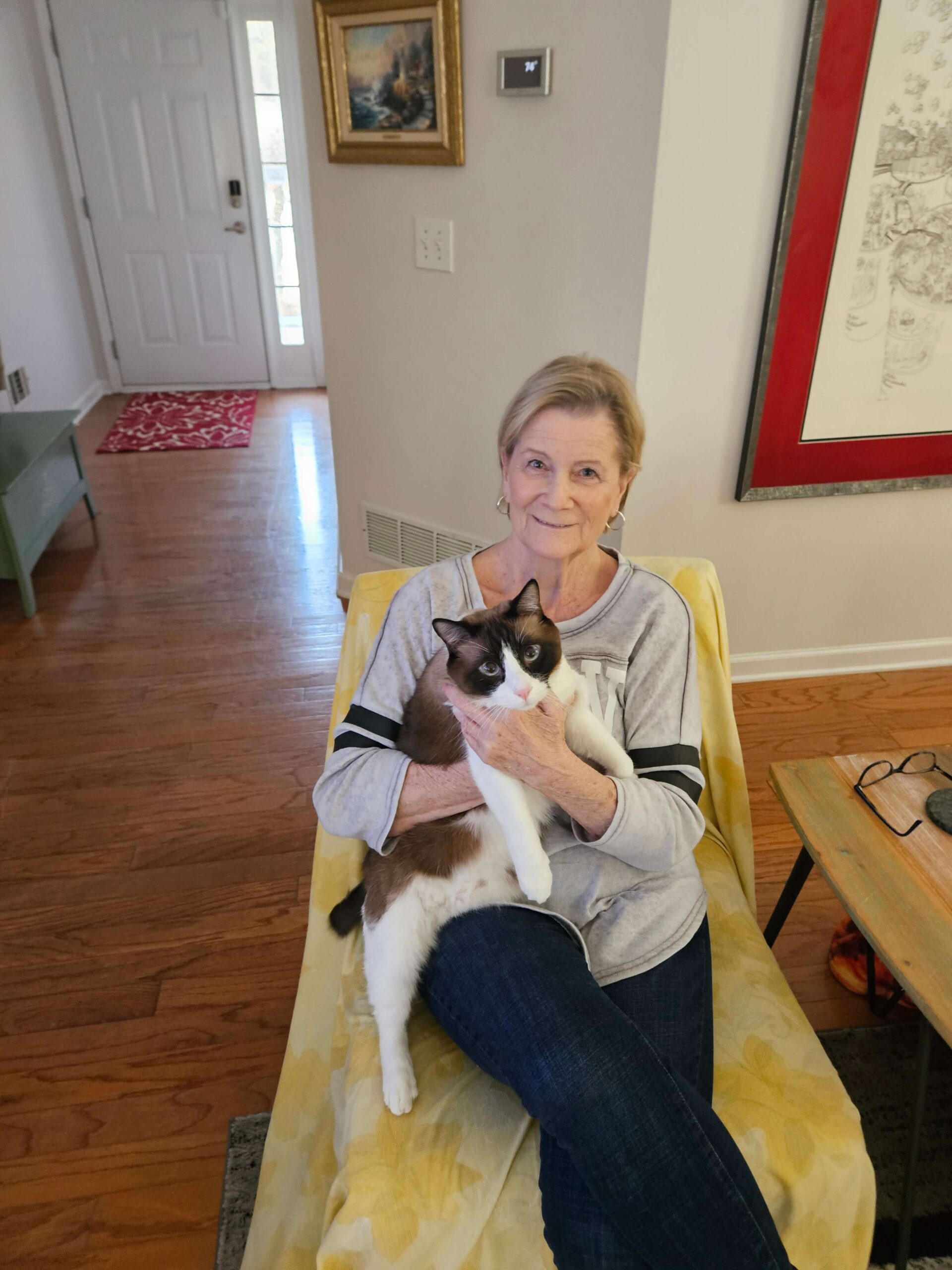 Linda Watson is a devoted retired mother and proud new grandmother, known affectionately by her grown children as “the cat whisperer.” Throughout her life, Linda has shared her home with a variety of animals—dogs, cats, birds, and even her brother’s pet rat—demonstrating a lifelong passion and natural talent for calming and caring for animals. Currently, she lives with two rescue cats aged 15 and 11, with the younger cat trusting only her and the older cat enough to emerge from hiding.